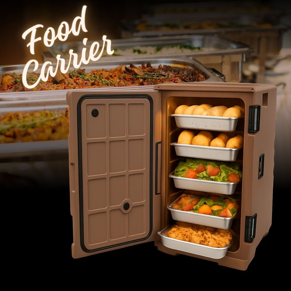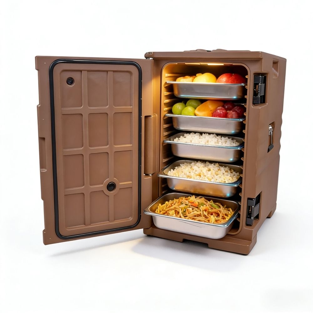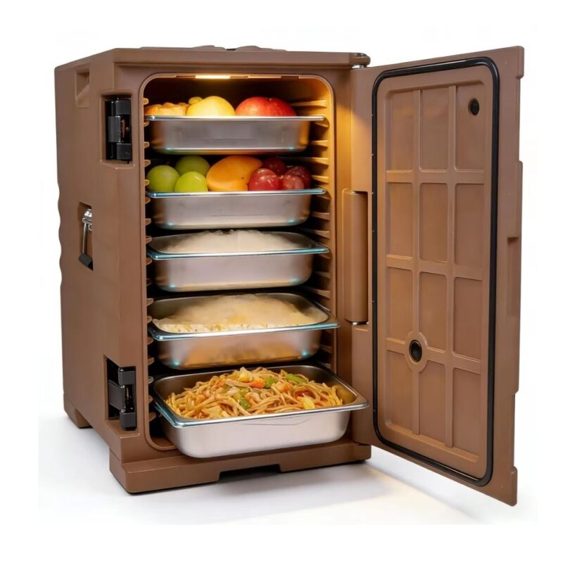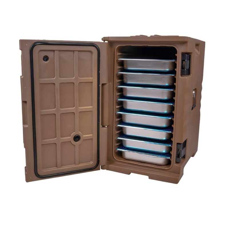 - Ισοθερμικό δοχείο μεταφοράς τροφίμων με μπροστινή φόρτωση, σχεδιασμένο για την ασφαλή διατήρηση της θερμοκρασίας ζεστών ή κρύων φαγητών.