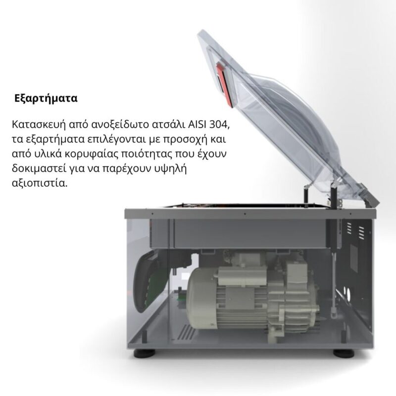 - Τροχήλατο μηχάνημα συσκευασίας κενού, κατασκευασμένο εξ’ ολοκλήρου από ανοξείδωτο ατσάλι AISI 304.