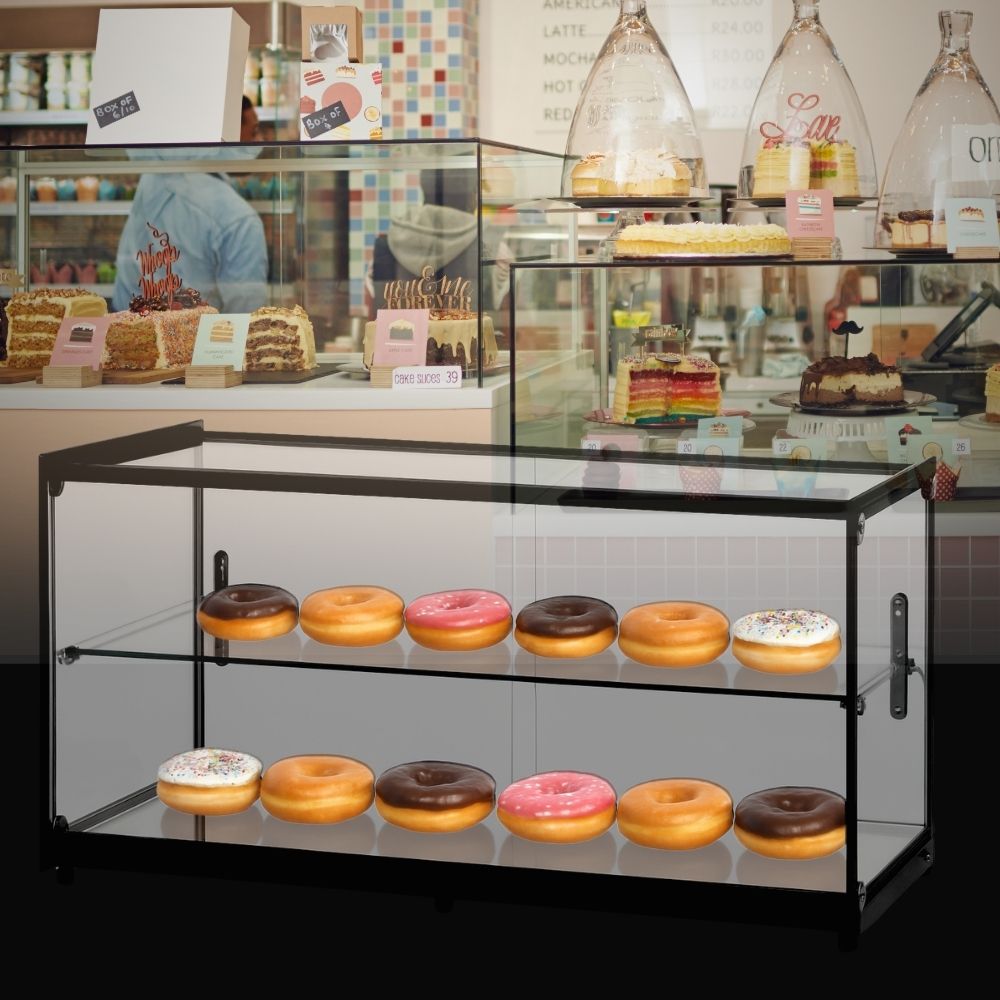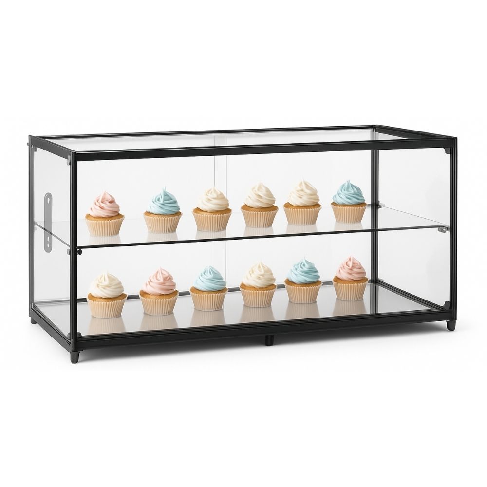 Βιτρίνα τροφίμων από ασφαλές γυαλί για ιδανική προβολή γλυκών, αρτοσκευασμάτων και σνακ σε επαγγελματικούς χώρους εστίασης.