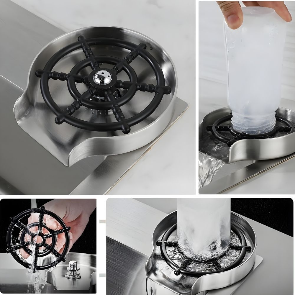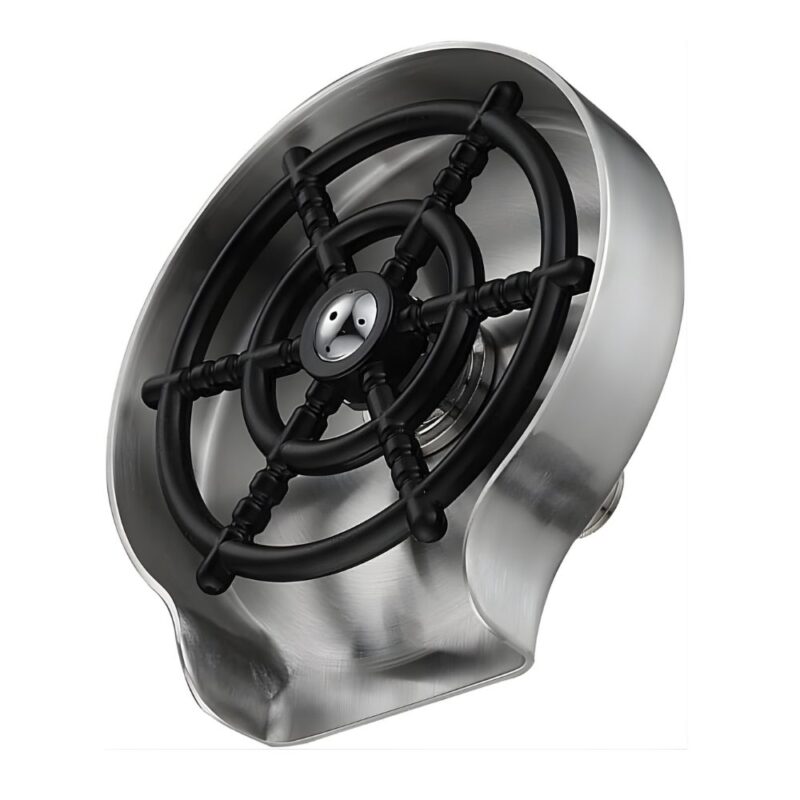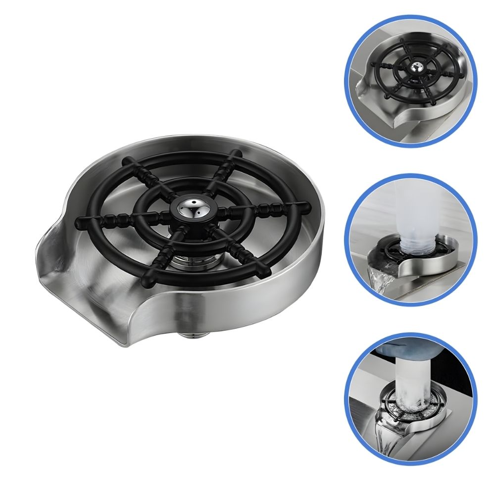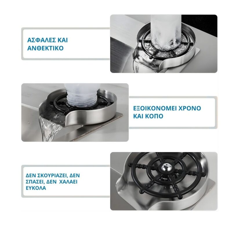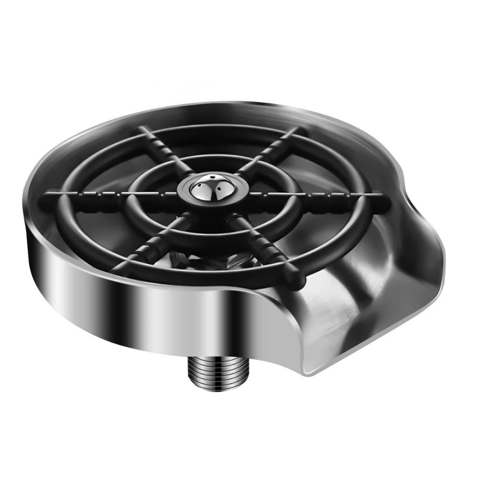 Αυτόματο ξέβγαλμα ποτηριών, σχεδιασμένο για εγκατάσταση σε νεροχύτη κουζίνας ή πάγκο μπαρ, για γρήγορο καθαρισμό γυάλινων σκευών όπως μπιμπερό, ποτήρια κρασιού και κούπες ταξιδιού. Με καθαρισμό υψηλής πίεσης, χρησιμοποιεί πίδακες νερού πολλαπλών γωνιών για να απομακρύνει τα υπολείμματα από δυσπρόσιτες γωνίες σε δευτερόλεπτα. Κατασκευασμένο από ανοξείδωτο ατσάλι για αντοχή στη σκουριά και τη διάβρωση. Λειτουργεί εύκολα πιέζοντας το χείλος του ποτηριού ή του φλιτζανιού στη βάση σε σχήμα αστεριού για να ενεργοποιήσει το ακροφύσιο. Σχεδιασμένη για σκεύη με στόμιο 3–11 εκατοστών, ιδανική για ποτήρια κρασιού, μπύρας και σέικερ. Τοποθετείται εύκολα σε κάθε επαγγελματικό πάγκο ή νεροχύτη, προσφέροντας εξοικονόμηση νερού και χρόνου και κόπου. Με έμφαση στην ανθεκτικότητα και την ταχύτητα εξυπηρέτησης, αποτελεί μια στρατηγική επένδυση για κάθε επαγγελματία που επιθυμεί άψογη παρουσίαση και ταχύτατο 'turnaround' στα σκεύη του.
