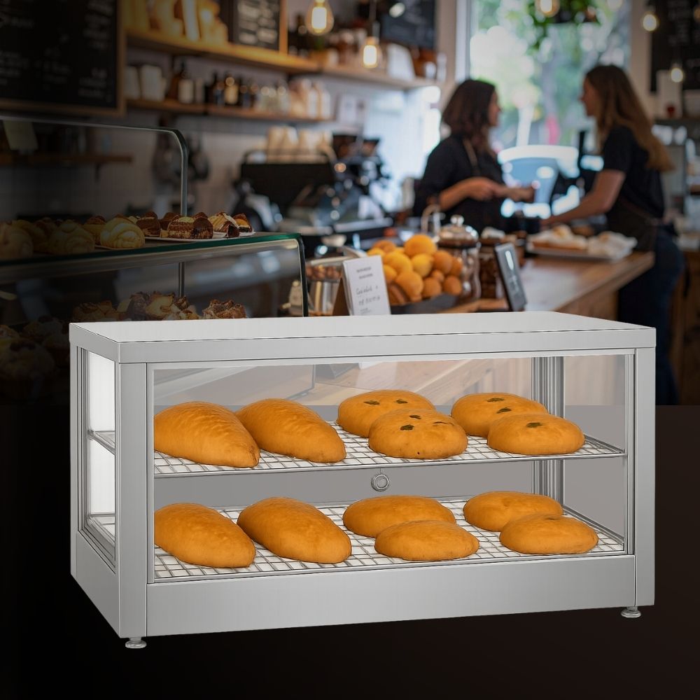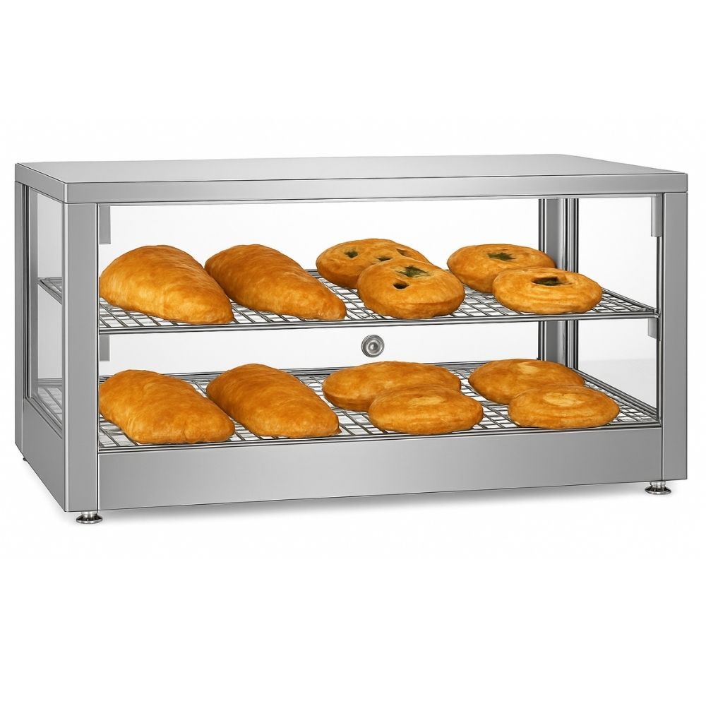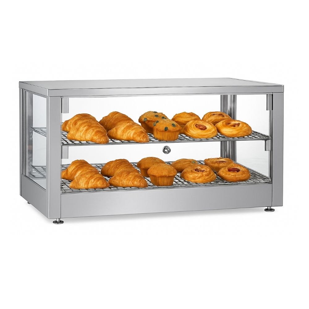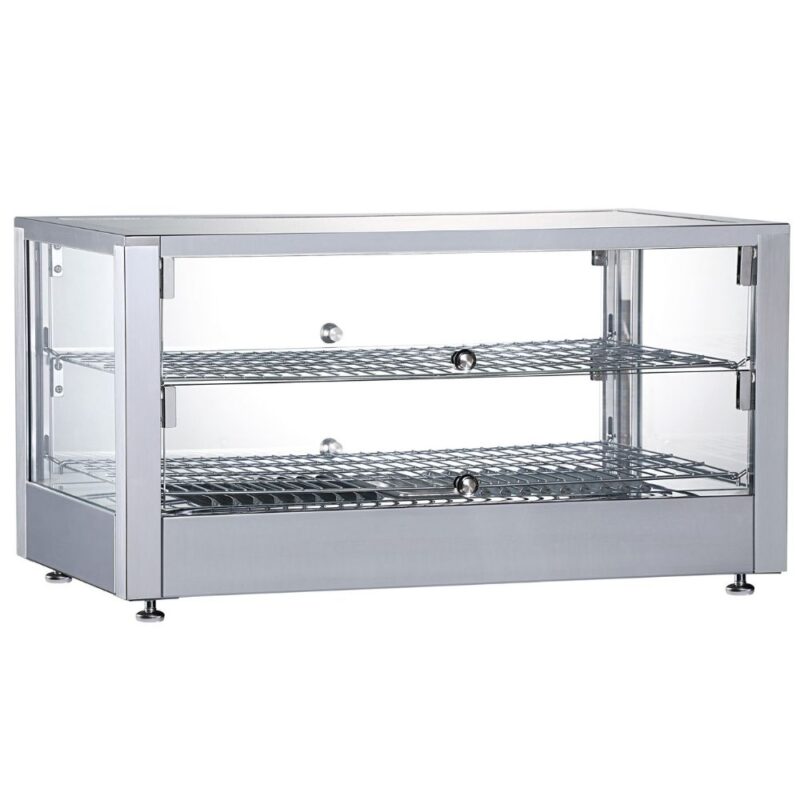 Θερμαινόμενη επιτραπέζια βιτρίνα που έχει σχεδιαστεί για να διατηρεί αρτοσκευάσματα, πίτσες και άλλα ζεστά σνακ στην ιδανική θερμοκρασία σερβιρίσματος. Διαθέτει ανθεκτικό περίβλημα από ανοξείδωτο ατσάλι για αντοχή και εύκολο καθαρισμό, προσφέροντας παράλληλα μέγιστη ορατότητα των τροφίμων. Διαθέτει ρυθμιζόμενο θερμοστάτη ακριβείας για την ρύθμιση του κατάλληλου επιπέδου θερμότητας. Στο εσωτερικό, τα σταθερά επιχρωμιωμένα ράφια παρέχουν στιβαρή στήριξη και ελκυστική παρουσίαση. Η πρόσβαση γίνεται εύκολα μέσω αρθρωτής ανοιγόμενης πόρτας, εξασφαλίζοντας αποδοτική λειτουργία. Ιδανική λύση για αρτοποιεία και κυλικεία, συνδυάζει τη στιβαρή κατασκευή με τη λειτουργικότητα για την υγιεινή και αποτελεσματική προβολή των τροφίμων.